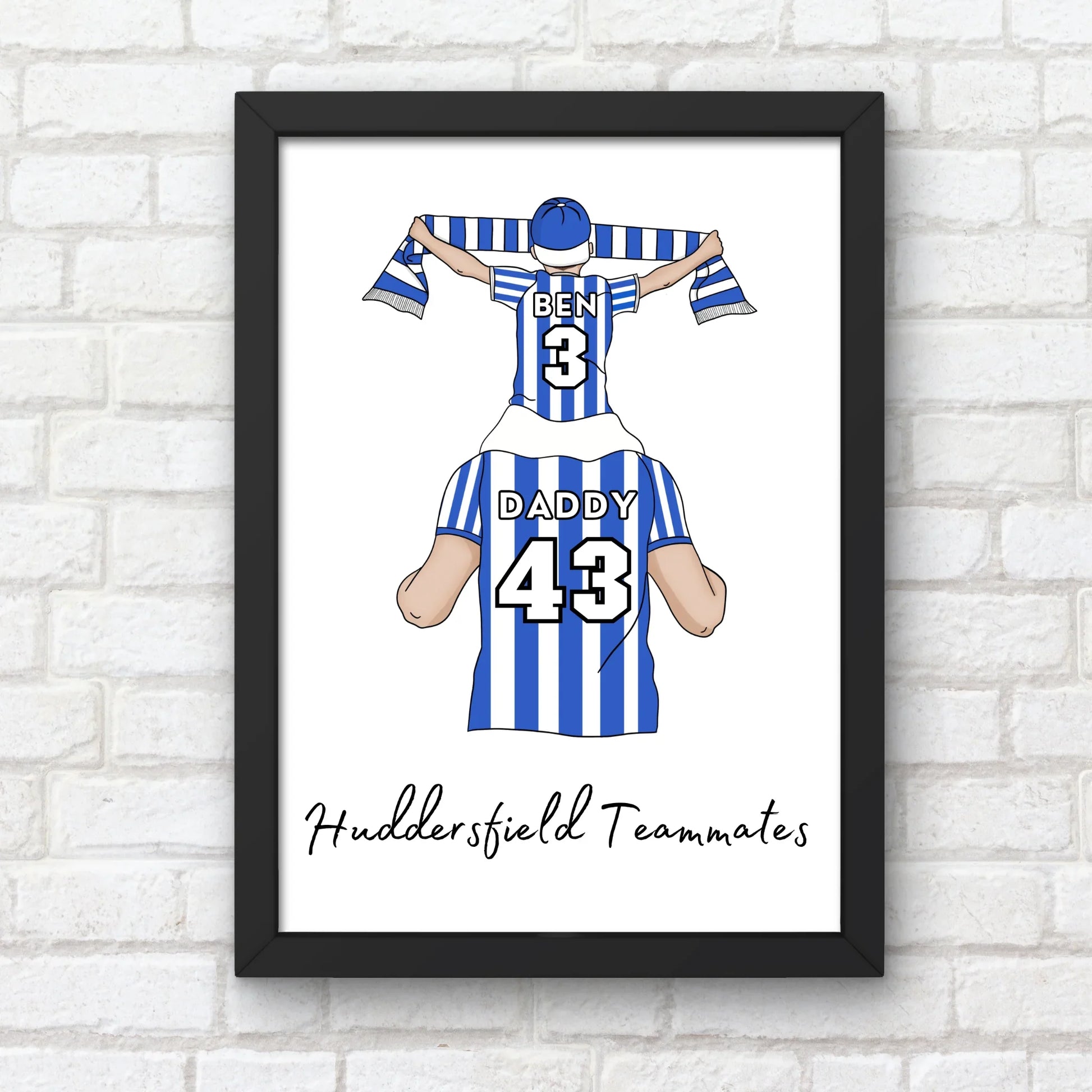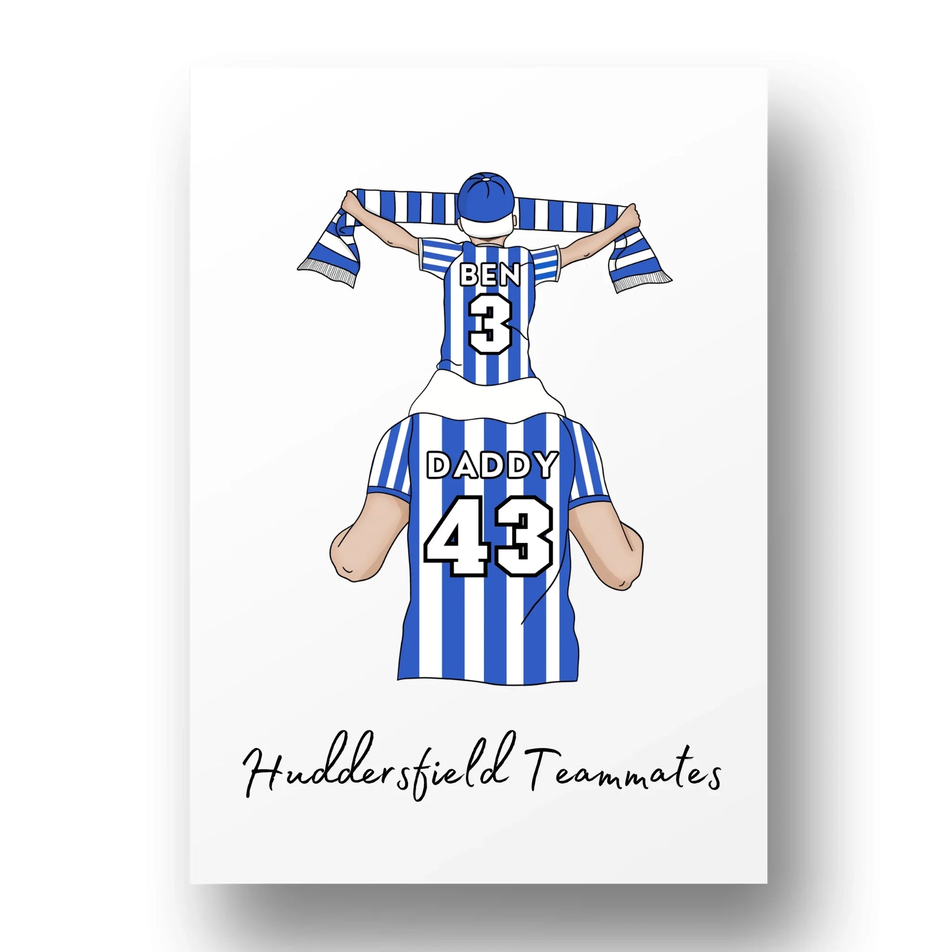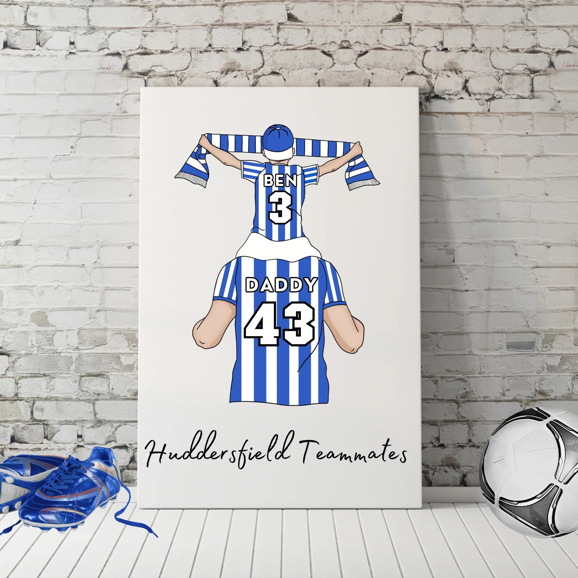 This personalised Father and Son Huddersfield wall art is ideal for any Huddersfield fan. A great addition to a child's bedroom, perfect for birthdays, Father's Day, Christmas, or simply to show them how special they are. This print is a one-of-a-kind, personalised creation that will be cherished. Perfect for a football fan.